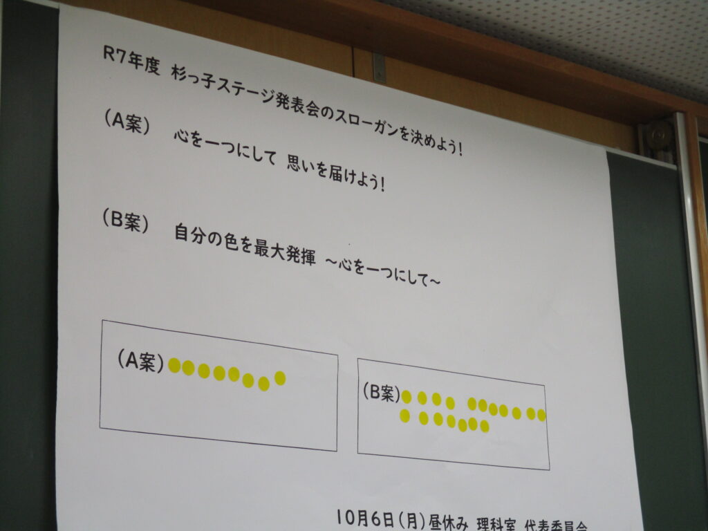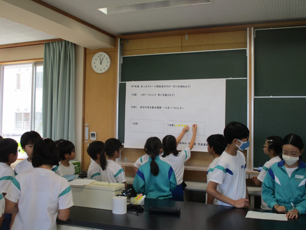 今回は各学級で話し合われた意見を基に、ステージ発表会のスローガンについて投票で決定しました。