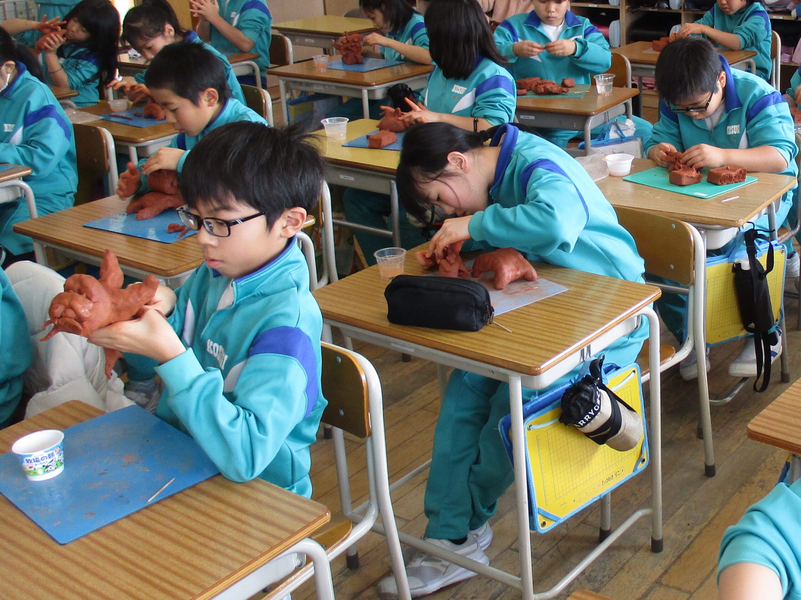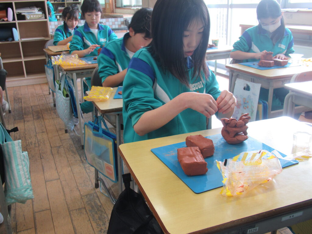 シーサー作りの先生に来ていただき、シーサー作りを行いました。始めに、シーサーの作り方やコツ等を教えてもらい、子供たちは手順を確認しながら真剣な眼差しで聞いていました。シーサー作りになると、子供たちは集中してシーサーの顔や体を作り上げ、自分だけのオリジナルシーサーを完成させました。「かわいい顔のシーサーができたよ」「はやくお家に持ち帰りたいな」と話し合う子供たちの姿が見られました。
