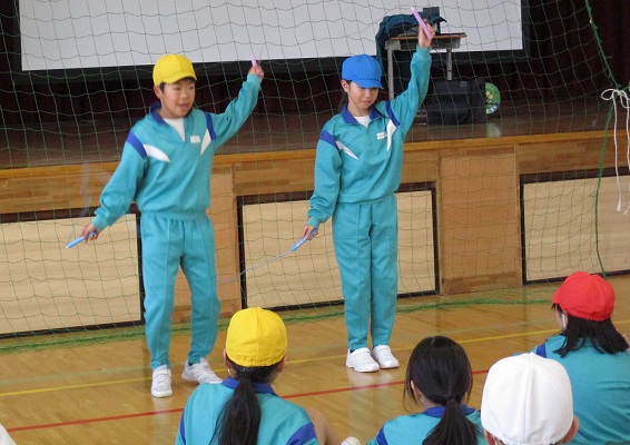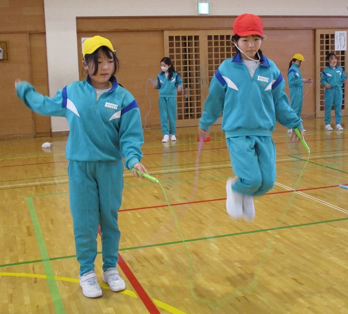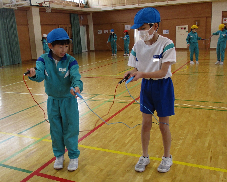 体育科では縄跳び運動の学習に取り組んでいます。これまでに取り組んできた技に加え、新しく連鎖交互跳びにチャレンジしました。連鎖交互跳びとは、片方の持ち手をペアの友達が握り、交互にリズミカルに跳んでいく技です。