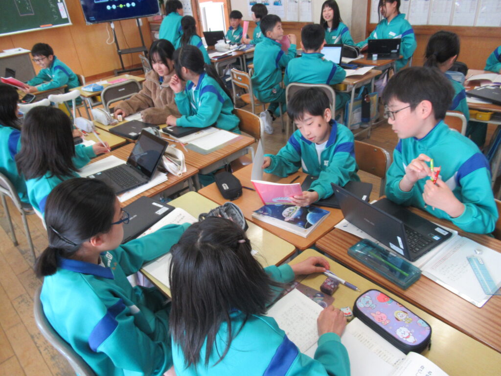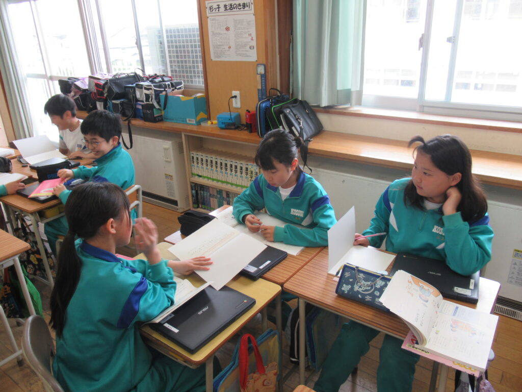 国語科の学習では、自分の名前の頭文字を使って、自分のことが相手に伝わるように自己紹介を作りました。自分の好きなことやがんばりたいことを取り入れて、一人一人が工夫した自己紹介を考えることができました。グループになって自分の作った自己紹介を発表し、感想を伝え合うことができました。友達の新たな一面にも気付くことができたようです。