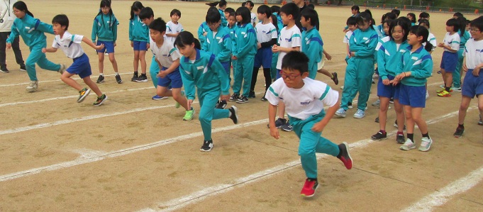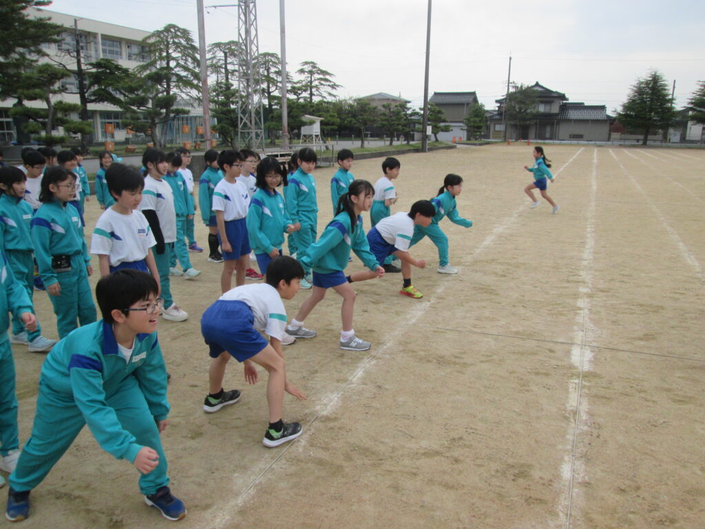 体育科では走・跳の運動が始まりました。「歩幅」と「回転数」をキーワードに、よりよい走りを目指して自分の体と対話をしながら動きを高めていきます。