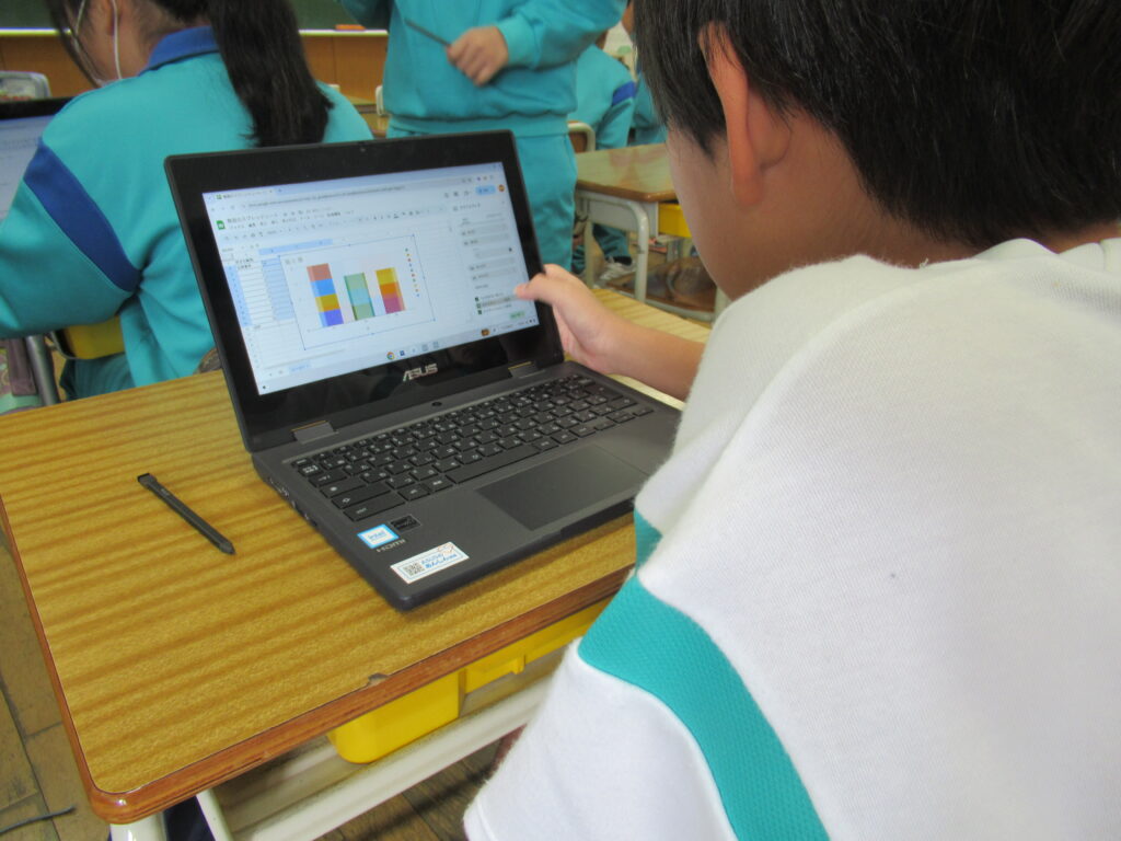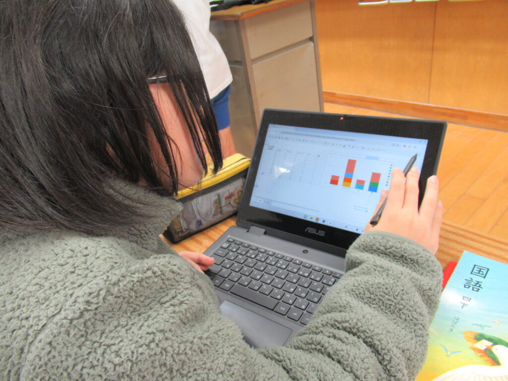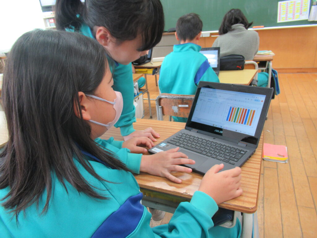 子供たちのタブレットが新しいものに変わり、使用していたソフトも変わったので、11月28日(金)に総合的な学習の時間に使用方法と活用法を学ぶためにICT授業を行いました。たくさんの数字の情報をソフトに打ち込み、グラフを作成するためのボタンを押すだけで、棒グラフや折れ線グラフがあっという間に完成しました。