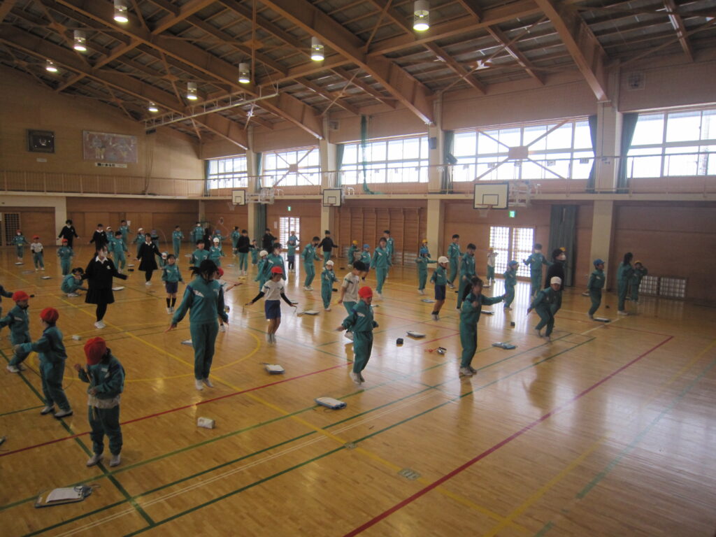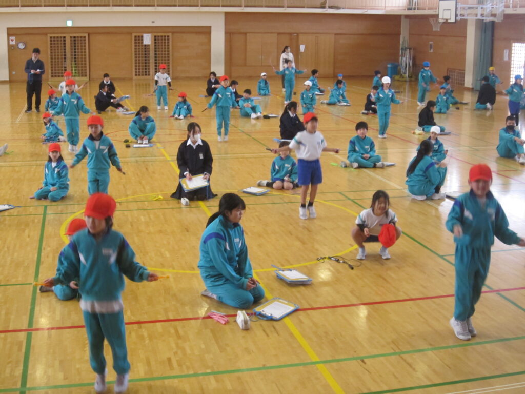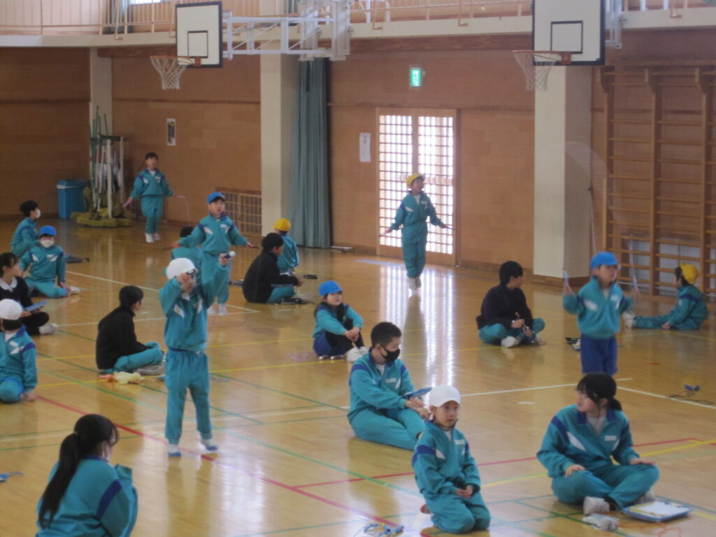 2学期からがんばって取り組んでいる縄跳びの記録会を行いました。1年生は6年生のお兄さん、お姉さんに数を数えてもらったり、難しい技を見せてもらったりしました。6年生は、1年生に跳び方を教えたり、責任をもって数を数えたりしました。楽しく交流しながら、縄跳びの技術を高めるために真剣な眼差しで取り組みました。