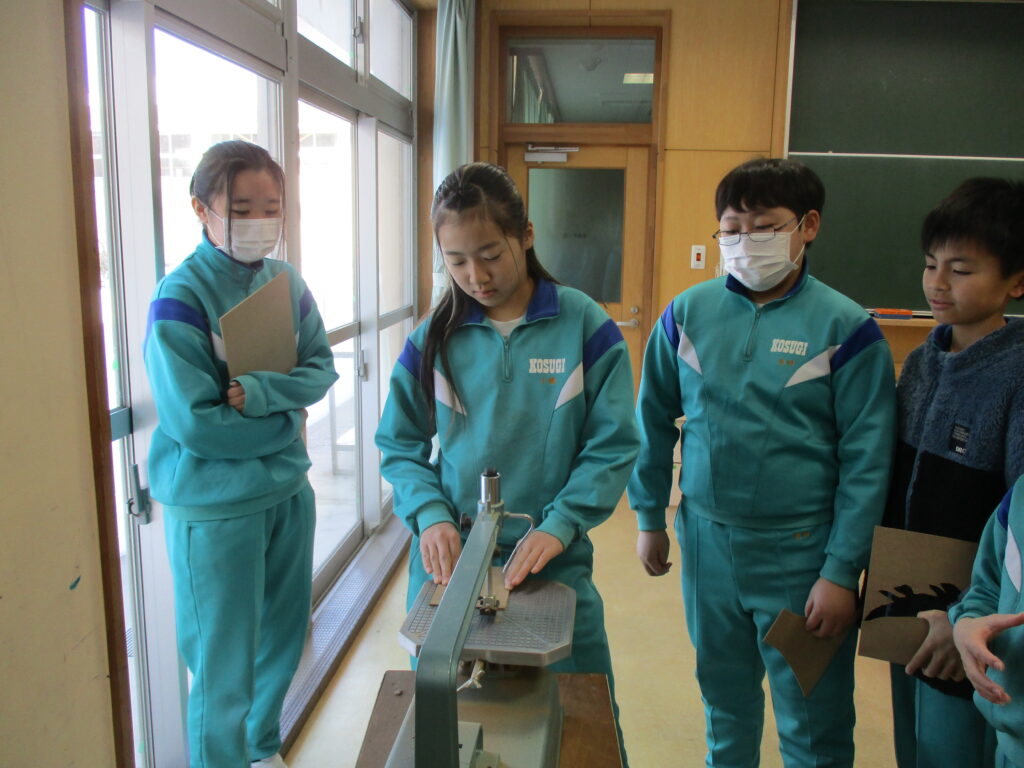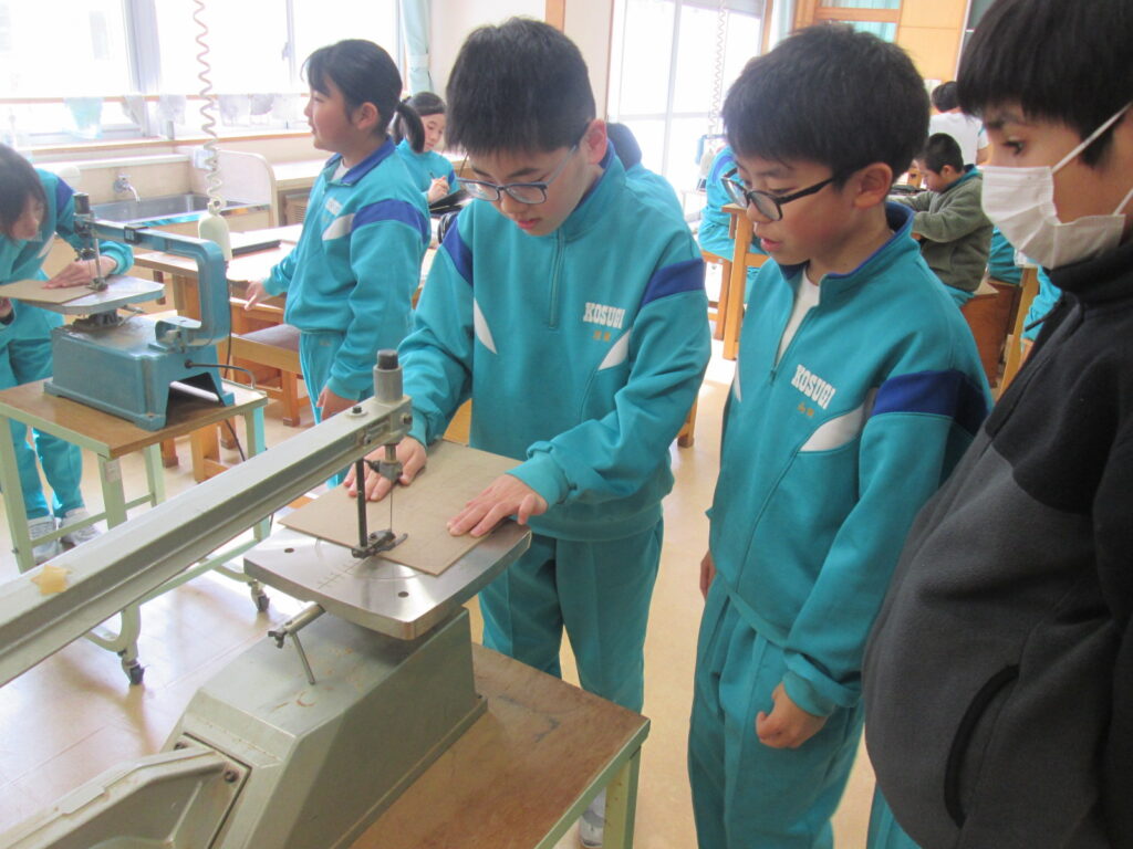 5年生は、図画工作科の学習で糸のこを使って作品を作っています。初めて糸のこを使ってみて、まっすぐ切ることや思い描いていた形に切ることが思っていたより難しく、苦戦していました。友達とアドバイスを伝え合いながら、一生懸命取り組んでいました。どんな形が出来上がるのか完成を想像しながら丁寧に学習を進めていきます。