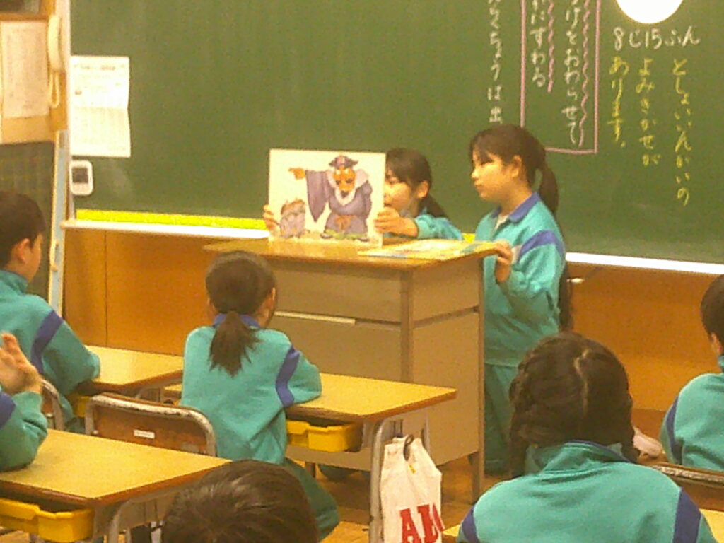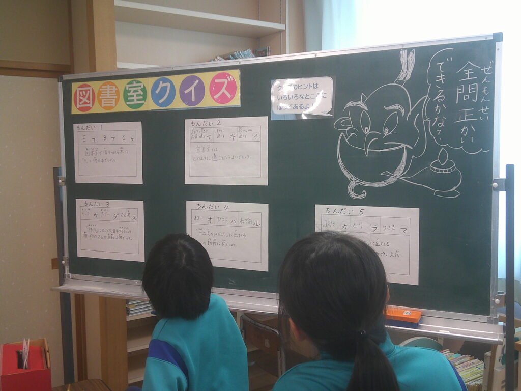 図書委員会では、読書週間の期間に杉っ子にさらに多くの本に親しんでもらおうと、様々な企画を考えました。朝読書の時間に一、二年生に紙芝居の読み聞かせをしたり、図書室内の黒板に「図書室クイズ」を掲示して杉っ子にクイズに挑戦してもらったりして、杉っ子が多くの本に親しめるようにという思いで活動しました。図書委員の紙芝居を真剣に聞いたり、図書室クイズに楽しそうに挑戦したりする姿が見られました。