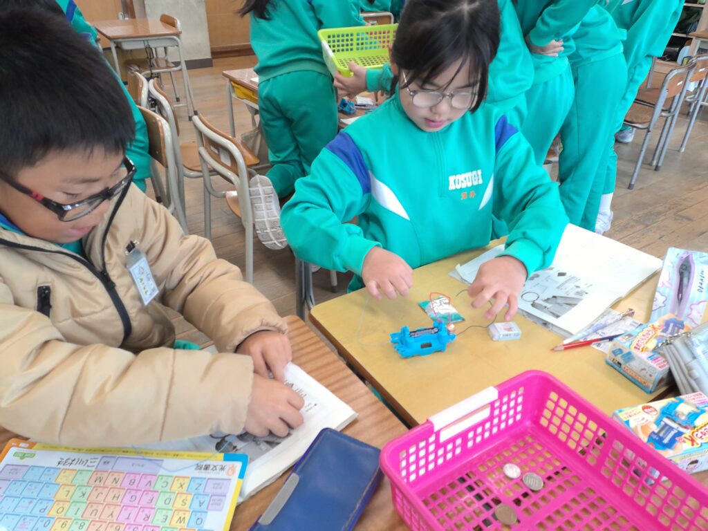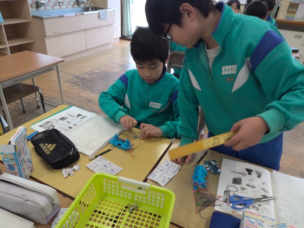 「アルミ缶は明かりが付くと思ったのに付かなかった。どうしてだろう?」「もっと他のものはどうなんだろう。もっと調べたい」と子供たちは新しい疑問を抱いたり、意欲を高めたりしているようでした。