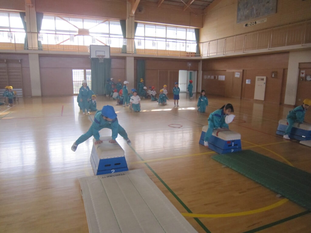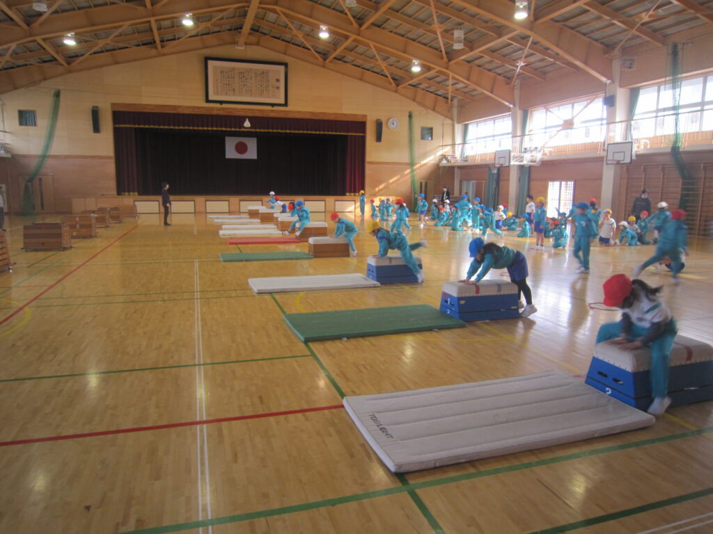 体育科の時間に跳び箱運動の学習を行いました。切り返し系では開脚跳び、回転系では台上前転を中心に試技に取り組みました。